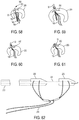 FIG. 54 is a schematic view of the meniscus tissue of FIG. 53 with the other of the needles removed and the other of the implants being tensioned;
