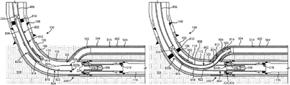 The lateral liner running tool 506 may further include one or more radial seals 514 configured to sealingly engage the inner radial surface of the lateral transition joint 502. The radial seals 514 may include, but are not limited to, metal-to-metal seals, elastomeric seals (e.g., O-rings or the like), crimp seals, and any combination thereof. The radial seals 514 provide a point of fluid isolation within the lateral transition joint 502 and the lateral liner 504 so that the lateral wellbore 304 might be completed with cement. More particularly, once the lateral liner 504 is properly positioned within the lateral wellbore 304, the lateral liner 504 may be cemented into the lateral wellbore 304. This may be accomplished by discharging cement out of the running tool head 510, circulating the cement through the interior of the lateral liner 504 and out its distal end, and flowing the cement into the annulus 514 formed between the liner 504 and the inner wall of the lateral wellbore 304. In other embodiments, however, the liner 504 may be secured within the lateral wellbore 304 using other means besides cement, such as mechanical fasteners, an interference fit, etc.