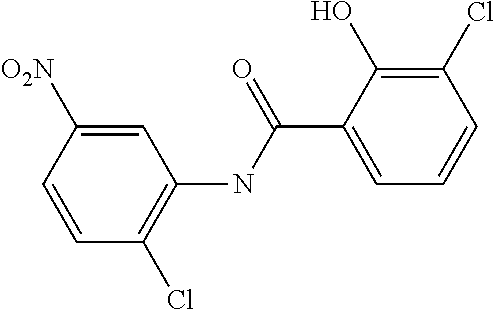 In these and certain other embodiments, only two of R5, R6, R7, R8, and R9 are present and these are NO2 and halogen (e.g., Cl, Br, or F) In other embodiments, one of R5, R6, R7, R8, and R9 is NO2, one of R5, R6, R7, R8, and R9 is halogen (e.g., Cl, Br, or F), and the rest are hydrogen. In certain embodiments niclosamide analogues include, but are not limited to niclosamide analogues in which one halogen group is relocated within the same ring or both halogen groups are relocated within the same ring, niclosamides in which the nitro group is relocated within the same ring, niclosamide analogues where the hydroxyl group is relocated within the same ring, niclosamide analogues where both halogen and hydroxy and/or nitro groups are relocated while keeping the substituents within the aromatic ring, compounds, except having except (3-chloro-4-nitrophenyl) in place of (2-chloro-4-nitrophenyl), niclosamide analogues having a nitro- and a hydroxyl group relocation, niclosamide analogues comprising a single halogen exchange, niclosamide analogues comprising a double halogen exchange, niclosamide analogs comprising an exchange of Cl— to Br—, niclosamide analogs comprising an exchange of Cl— to F—, and the like.
