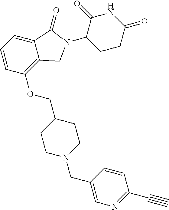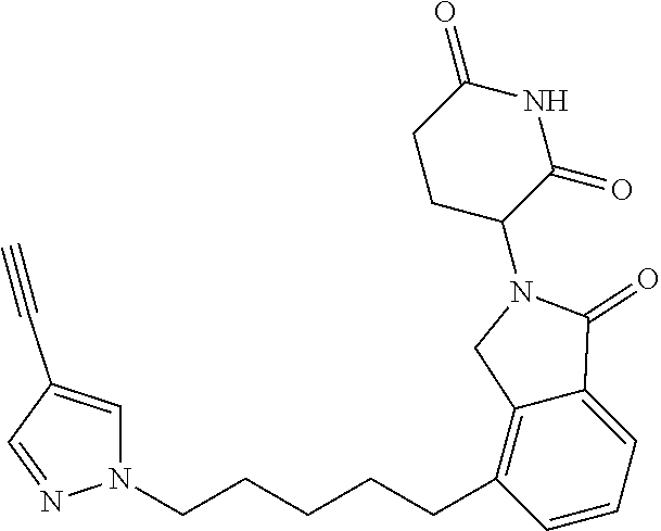 - KQQIHPPZAWMCRO-UHFFFAOYSA-N C#CC1=CN(CCCC#CC2=C3CN(C4CCC(=O)NC4=O)C(=O)C3=CC=C2)C=N1.O=C1CCC(N2CC3=C(Br)C=CC=C3C2=O)C(=O)N1.O=C1CCC(N2CC3=C(C#CCCCN4C=CN=C4)C=CC=C3C2=O)C(=O)N1.O=C1CCC(N2CC3=C(C#CCCCN4C=NC(I)=C4)C=CC=C3C2=O)C(=O)N1 Chemical compound C#CC1=CN(CCCC#CC2=C3CN(C4CCC(=O)NC4=O)C(=O)C3=CC=C2)C=N1.O=C1CCC(N2CC3=C(Br)C=CC=C3C2=O)C(=O)N1.O=C1CCC(N2CC3=C(C#CCCCN4C=CN=C4)C=CC=C3C2=O)C(=O)N1.O=C1CCC(N2CC3=C(C#CCCCN4C=NC(I)=C4)C=CC=C3C2=O)C(=O)N1 KQQIHPPZAWMCRO-UHFFFAOYSA-N 0.000 description 1