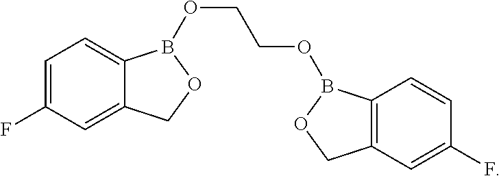 each of RA and RB is independently derived from the group consisting of 5-fluoro-1,3-dihydro-1-hydroxy-2,1-benzoxaborole; 5-chloro-1,3-dihydro-1-hydroxy-2,1-benzoxaborole; 1,3-dihydro-1-hydroxy-2,1-benzoxaborole; and combinations thereof;