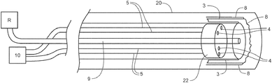 FIG. 5 illustrates catheter (1) within the lumen of outer guide catheter (20), wherein the reflector(s) (3) are disposed on the inner surface or lining of the litho-cushion (8) in an undeployed configuration.