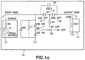 - FIG. 1 c shows the “off” state of the switch 10 of FIG. 1 a (i.e., FIG. 1 c shows the equivalent small-signal values of the transistors M 1 and M 2 when the RF switch 10 is “off”, with switching transistor M 1 5 off, and shunting transistor M 2 7 on).