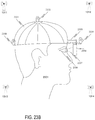 FIGS. 23B and 23C illustrate headgear 2331 and 2340 of types other than a helmet. In FIG. 23B a hat type headgear 2331 may include wireless position devices 2330-2333 at various position on a hat 2331, such as a crown of a hat 2332; a rear portion of a hat 2330 and a brim of a hat 2335. In addition, a display fixture 2333 may support a user viewable display 2334 that is within a field of view 2337 of an eye 2336 of a user 2301.
