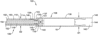 The outer tubular member 102 may extend distally from a proximal end 105. The proximal end 105 of the outer tubular member 102 may be positioned within the first hub portion 126. The outer tubular member 102 may include a lumen 150 extending from the proximal end 105 to a distal end 103 of the outer tubular member 102. The inner tubular member 110 may be slidably disposed within the lumen 150 of the outer tubular member 102. In some instances, the outer tubular member 102 may be coupled or affixed to the first hub portion 126 adjacent the proximal end 105 of the outer tubular member 102, although this is not required. It is contemplated that the outer tubular member 102 may be affixed to the first hub portion 126 at any longitudinal location desired.