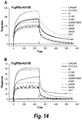 FIG. 14 depicts the results of surface plasmon resonance experiments investigating the binding of modified anti-CD52 to both FcγRIIIa (Val158) (as above) and FcγRIIIa (Phe158). Anti-CD52 antibodies comprising S298N/Y300S mutations in the Fc domain were used to assess the effector function of the modified molecule binding to FcγRIIIa (Val158, FIG. 14A) and FcγRIIIa (Phe58, FIG. 14B).