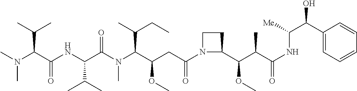 To generate aminooxy-derivatized Dol10 (Aminooxy-Cys-MC-VC-PABC-PEG8-Dol10), 7.4 mg (0.024 mmol, 3 eq.) of aminooxy-cystamide, 12 mg (0.008 mmol) of MC-VC-PABC-PEG8-Dol10 and 30 μL triethylamine were combined in 3 mL of DMF. The reaction was complete within 15 minutes according to HPLC analysis. Preparative HPLC purification resulted in 6.2 mg (46%) of the desired product as an offwhite solid. Reversed-phase HPLC analysis suggests the purity of the compound to be >96%. ESI calcd for C80H124N16019S2 (MH)+1678.0664; found, m/z 1678.0613.