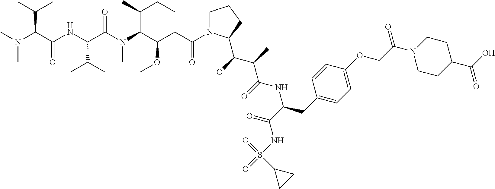 - SCJNQTWHLUGDSK-DQWZJNAQSA-N CC[C@H](C)[C@@H]([C@@H](CC(=O)N1CCC[C@H]1[C@H](OC)[C@@H](C)C(=O)N[C@@H](CC1=CC=CC=C1)C(=O)NS(=O)(=O)C1CC1)OC)N(C)C(=O)[C@@H](CC(=O)[C@H](C(C)C)N(C)C(=O)OCC1=CC=C(NC(=O)[C@H](C)CC(=O)CCOCCOCCC(=O)N2CCC(C(=O)O)CC2)C=C1)C(C)C Chemical compound CC[C@H](C)[C@@H]([C@@H](CC(=O)N1CCC[C@H]1[C@H](OC)[C@@H](C)C(=O)N[C@@H](CC1=CC=CC=C1)C(=O)NS(=O)(=O)C1CC1)OC)N(C)C(=O)[C@@H](CC(=O)[C@H](C(C)C)N(C)C(=O)OCC1=CC=C(NC(=O)[C@H](C)CC(=O)CCOCCOCCC(=O)N2CCC(C(=O)O)CC2)C=C1)C(C)C SCJNQTWHLUGDSK-DQWZJNAQSA-N 0.000 description 2