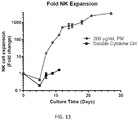 FIG. 12 shows that optimized PM-mb15-41BBL vesicles expand NK cells equally well as live feeder cells. PBMC were co-cultured with optimized (n=6) or initial (n=4) PM vesicle preparations at 200 μg of membrane protein/mL or were co-cultured with 1×106/mL K562-mb15-41BBL live feeders (n=6, Feeders positive ctrl) or 50 ng/mL soluble IL-15 and 50 ng/mL soluble 41BBL (n=6, SC Ctrl) for up to 20 days. The plot depicts the fold of NK cell expansion after 12-13 days in culture.
