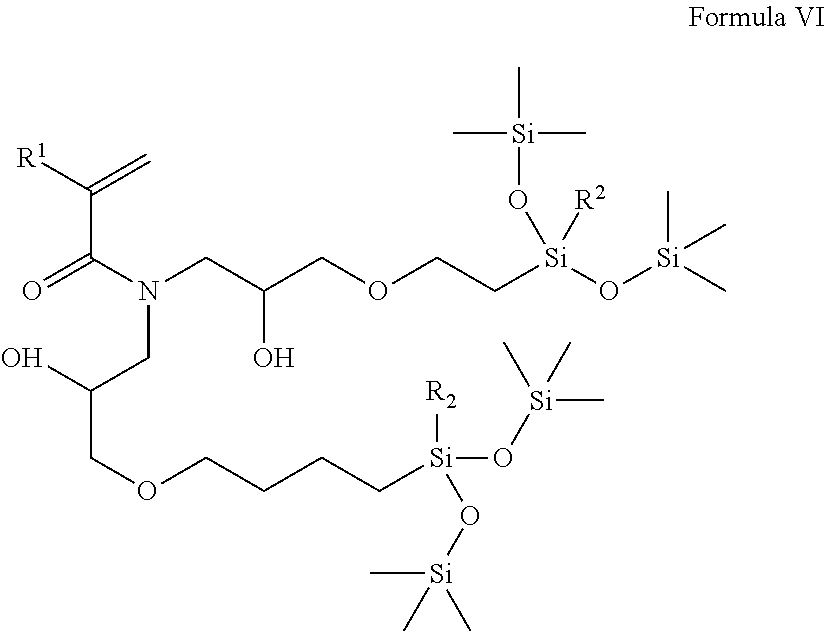 Examples of hydroxyl-containing silicone monomers include propenoic acid-2-methyl-2-hydroxy-3-[3-[1,3,3,3-tetramethyl-1-[(trimethylsilyl)oxy]-1-disiloxanyl]propoxy]propyl ester (“SiGMA”), and 2-hydroxy-3-methacryloxypropyloxypropyl-tris(trimethylsiloxy)silane, and compounds of Formula VI: