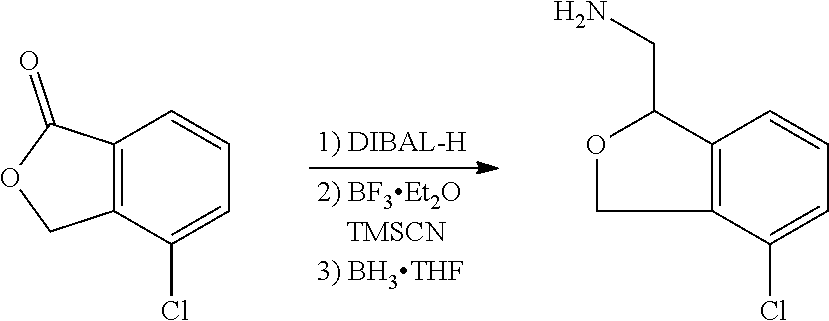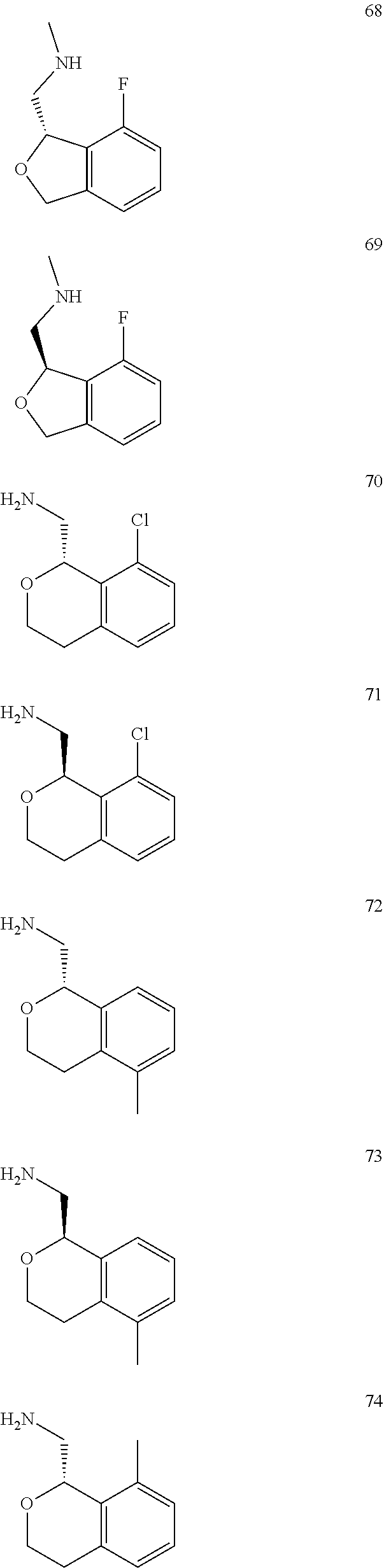 indicates a single enantiomer with the absolute configuration depicted, e.g., ((R)-1-((R)-5-fluoroisochroman-1-yl)ethan-1-amine in the illustration above. In the text describing the stereochemistry of the examples, the convention of Chemical Abstracts is used. Thus “(R)-1-((R)-5-rel- . . . ” indicates that the two chiral centers are in that relative relationship, which would be depicted in a structural diagram by solid bold and dashed lines, whereas “(R)-1-((R)-5- . . . ” without the “rel” indicates a single enantiomer of that absolute configuration, which would be depicted in a structural diagram by solid and broken wedges.