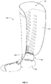 In other embodiments, the apertures 120 in the upper region of the base shell 102 can have different sizes and shapes and can be extending at an angle. Some or all of the apertures 120 can also be arranged in a plurality of rows. Some or all of the apertures 120 in the foot receiving portion 103 of the base shell 120 can comprise a series of slots extending at an angle and a singular larger, irregularly shaped non-through hole in the toe region.