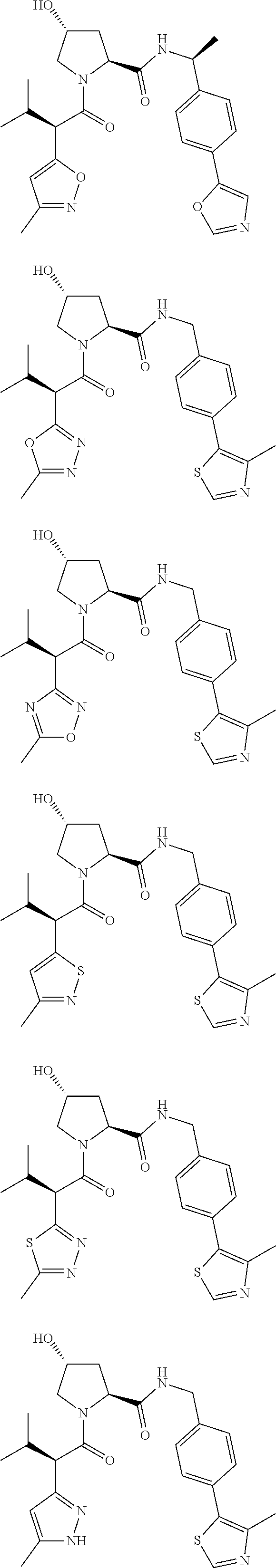 - PLPBWNBESUGDGP-UHFFFAOYSA-N CC(=O)NC(C(=O)N1CC(O)CC1C(=O)NCC1=CC=C(C2=C(C)N=CS2)C=C1C(C)(C)C)C(C)(C)C.CC1=C(C2=CC=C(CNC(=O)C3CC(O)CN3C(=O)C(C(C)C)N3CC4=C(C3=O)C(F)=CC=C4)C(C(C)(C)C)=C2)SC=N1.CC1=C(C2=CC=C(CNC(=O)C3CC(O)CN3C(=O)C(C(C)C)N3CC4=C(C=CC=C4)C3=O)C(C(C)(C)C)=C2)OC=N1.CC1=C(C2=CC=C(CNC(=O)C3CC(O)CN3C(=O)C(C(C)C)N3CC4=C(C=CC=C4)C3=O)C(C(C)(C)C)=C2)SC=N1 Chemical compound CC(=O)NC(C(=O)N1CC(O)CC1C(=O)NCC1=CC=C(C2=C(C)N=CS2)C=C1C(C)(C)C)C(C)(C)C.CC1=C(C2=CC=C(CNC(=O)C3CC(O)CN3C(=O)C(C(C)C)N3CC4=C(C3=O)C(F)=CC=C4)C(C(C)(C)C)=C2)SC=N1.CC1=C(C2=CC=C(CNC(=O)C3CC(O)CN3C(=O)C(C(C)C)N3CC4=C(C=CC=C4)C3=O)C(C(C)(C)C)=C2)OC=N1.CC1=C(C2=CC=C(CNC(=O)C3CC(O)CN3C(=O)C(C(C)C)N3CC4=C(C=CC=C4)C3=O)C(C(C)(C)C)=C2)SC=N1 PLPBWNBESUGDGP-UHFFFAOYSA-N 0.000 description 1