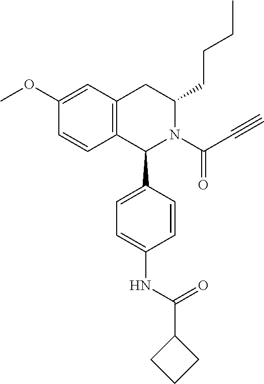 - BZVCDXQCYSGCEV-DRRPJVCTSA-N C#CC(=O)N1[C@@H](C)CC2=CC(OC)=CC=C2[C@@H]1C1=CC=C(F)C=C1.C#CC(=O)N1[C@@H](C)CC2=CC(OC)=CC=C2[C@H]1C1=CC=C(F)C=C1.C#CC(=O)N1[C@@H](CCCC)CC2=CC(OC)=CC=C2[C@@H]1C1=CC=C(F)C=C1.CCCC[C@H]1CC2=CC(OC)=CC=C2[C@H](C2=CC=C(F)C=C2)N1C(=O)CCl.COC(=O)C1=CC=C([C@H]2C3=CC=C(OC)C=C3C[C@H](C)N2C(=O)CCl)C=C1.COC1=CC=C2C(=C1)C[C@H](C)N(C(=O)CCl)[C@H]2C1=CC=C(F)C=C1 Chemical compound C#CC(=O)N1[C@@H](C)CC2=CC(OC)=CC=C2[C@@H]1C1=CC=C(F)C=C1.C#CC(=O)N1[C@@H](C)CC2=CC(OC)=CC=C2[C@H]1C1=CC=C(F)C=C1.C#CC(=O)N1[C@@H](CCCC)CC2=CC(OC)=CC=C2[C@@H]1C1=CC=C(F)C=C1.CCCC[C@H]1CC2=CC(OC)=CC=C2[C@H](C2=CC=C(F)C=C2)N1C(=O)CCl.COC(=O)C1=CC=C([C@H]2C3=CC=C(OC)C=C3C[C@H](C)N2C(=O)CCl)C=C1.COC1=CC=C2C(=C1)C[C@H](C)N(C(=O)CCl)[C@H]2C1=CC=C(F)C=C1 BZVCDXQCYSGCEV-DRRPJVCTSA-N 0.000 description 1