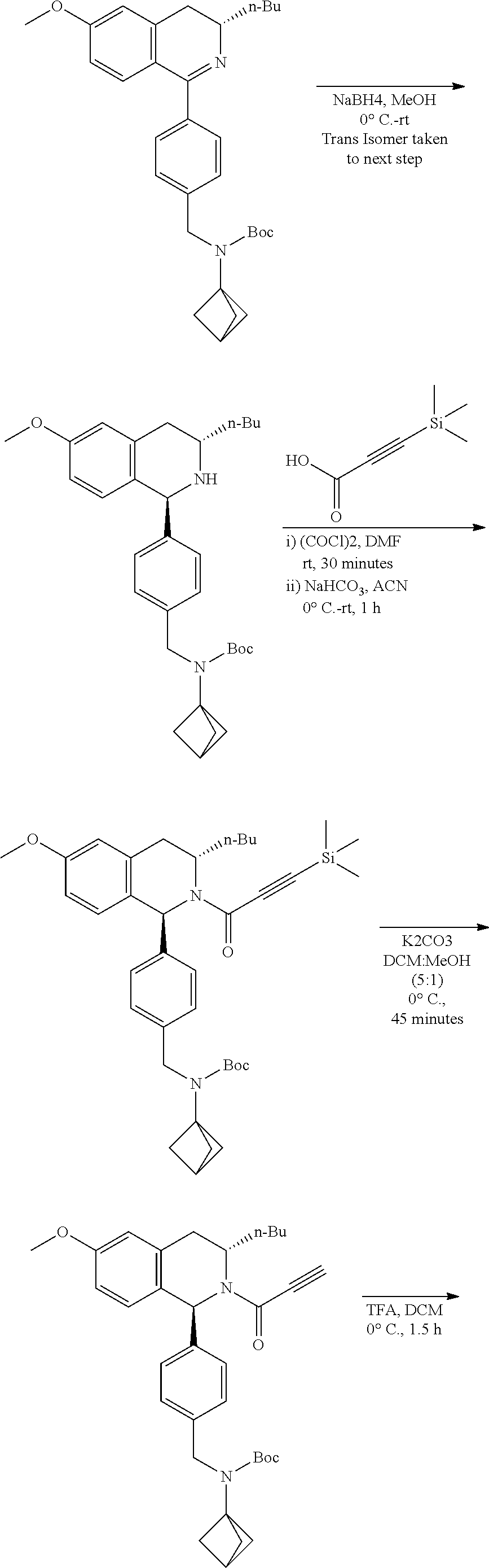 - NNBYPQQLQORPLN-UCLBXKJPSA-N C#CC(=O)N1[C@@H](CCCC)CC2=C(C=CC(OC)=C2)[C@@H]1C1=CC=C(CN(C(=O)OC(C)(C)C)C23CC(C2)C3)C=C1.CCCC[C@H]1CC2=C(C=CC(OC)=C2)C(C2=CC=C(CN(C(=O)OC(C)(C)C)C34CC(C3)C4)C=C2)=N1.CCCC[C@H]1CC2=C(C=CC(OC)=C2)[C@H](C2=CC=C(CN(C(=O)OC(C)(C)C)C34CC(C3)C4)C=C2)N1.CCCC[C@H]1CC2=C(C=CC(OC)=C2)[C@H](C2=CC=C(CN(C(=O)OC(C)(C)C)C34CC(C3)C4)C=C2)N1C(=O)C#C[Si](C)(C)C.C[Si](C)(C)C#CC(=O)O Chemical compound C#CC(=O)N1[C@@H](CCCC)CC2=C(C=CC(OC)=C2)[C@@H]1C1=CC=C(CN(C(=O)OC(C)(C)C)C23CC(C2)C3)C=C1.CCCC[C@H]1CC2=C(C=CC(OC)=C2)C(C2=CC=C(CN(C(=O)OC(C)(C)C)C34CC(C3)C4)C=C2)=N1.CCCC[C@H]1CC2=C(C=CC(OC)=C2)[C@H](C2=CC=C(CN(C(=O)OC(C)(C)C)C34CC(C3)C4)C=C2)N1.CCCC[C@H]1CC2=C(C=CC(OC)=C2)[C@H](C2=CC=C(CN(C(=O)OC(C)(C)C)C34CC(C3)C4)C=C2)N1C(=O)C#C[Si](C)(C)C.C[Si](C)(C)C#CC(=O)O NNBYPQQLQORPLN-UCLBXKJPSA-N 0.000 description 1