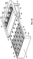 FIG. 6D is a top perspective view of a SWIIN module with the retentate and perforated members in partial cross section. In this FIG. 6D, it can be seen that serpentine channel 660 a is disposed on the top of permeate member 608 is defined by raised portions 676 and traverses permeate member 608 for most of the length and width of permeate member 608 except for the portion of permeate member 608 that comprises the permeate and retentate reservoirs (note only one retentate reservoir 652 can be seen). Moving from left to right, reservoir gasket 658 is disposed upon the integrated reservoir cover 678 (cover not seen in this FIG. 6D) of retentate member 604. Gasket 658 comprises reservoir access apertures 632 a, 632 b, 632 c, and 632 d, as well as pneumatic ports 633 a, 633 b, 633 c and 633 d. Also at the far left end is support 670. Disposed under permeate reservoir 652 can be seen one of two reservoir seals 662. In addition to the retentate member being in cross section, the perforated member 601 and filter 603 (filter 603 is not seen in this FIG. 6D) are in cross section. Note that there are a number of ultrasonic tabs 664 disposed at the right end of SWIIN module 650 and on raised portion 676 which defines the channel turns of serpentine channel 660 a, including ultrasonic tabs 664 extending through through-holes 666 of perforated member 601. There is also a support 670 at the end distal reservoirs 652, 654 of permeate member 608.