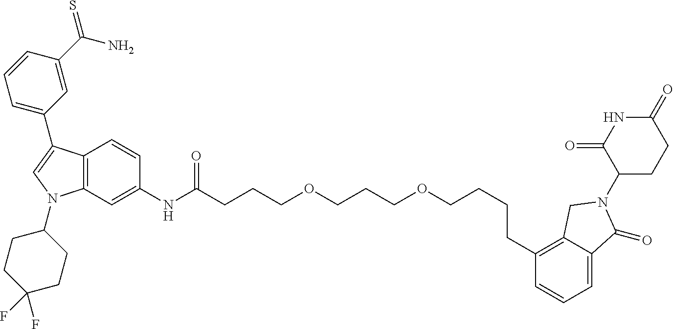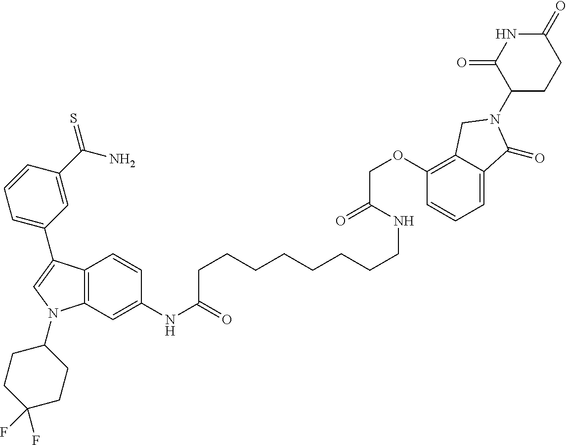- GQAMXEHZYQJXDH-UHFFFAOYSA-N NC(=S)C1=CC(C2=CN(C3CCC(F)(F)CC3)C3=C2C=CC(NC(=O)CCCCCCCCNC(=O)COC2=C4CN(C5CCC(=O)NC5=O)C(=O)C4=CC=C2)=C3)=CC=C1 Chemical compound NC(=S)C1=CC(C2=CN(C3CCC(F)(F)CC3)C3=C2C=CC(NC(=O)CCCCCCCCNC(=O)COC2=C4CN(C5CCC(=O)NC5=O)C(=O)C4=CC=C2)=C3)=CC=C1 GQAMXEHZYQJXDH-UHFFFAOYSA-N 0.000 description 5