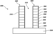 - In some embodiments, a full liner 310 may be formed over the stacks 305, as shown in FIG. 3F. Referring back to FIG. 3A, portions of the materials overlying the substrate 320 may be removed to expose a top surface of the substrate 320. Rather than terminating the etch on an intermediate dielectric material 340 or another intermediate material as in FIG. 3B, portions of all the alternating dielectric materials 340 and conductive materials 350 overlying the substrate 320 are removed until the top surface of the substrate 320 is exposed, forming stacks 305. The full liner 310 may be conformally formed over the stacks 305. The full liner 310 may contact alternating portions of the dielectric material 340 and the conductive material 350, the control gate material 330, and a portion of the substrate 320. The full liner 310 may be formed as described above with reference to FIG. 1A through FIG. 1C and may include alucone, alucone and aluminum oxide, a gradient of alucone, or combinations thereof. In some embodiments, the full liner 210 may optionally include silicon atoms and/or nitride atoms as described above with reference to FIG. 1A through FIG. 1C. In some embodiments, the full liner 310 is oxidized as previously described.