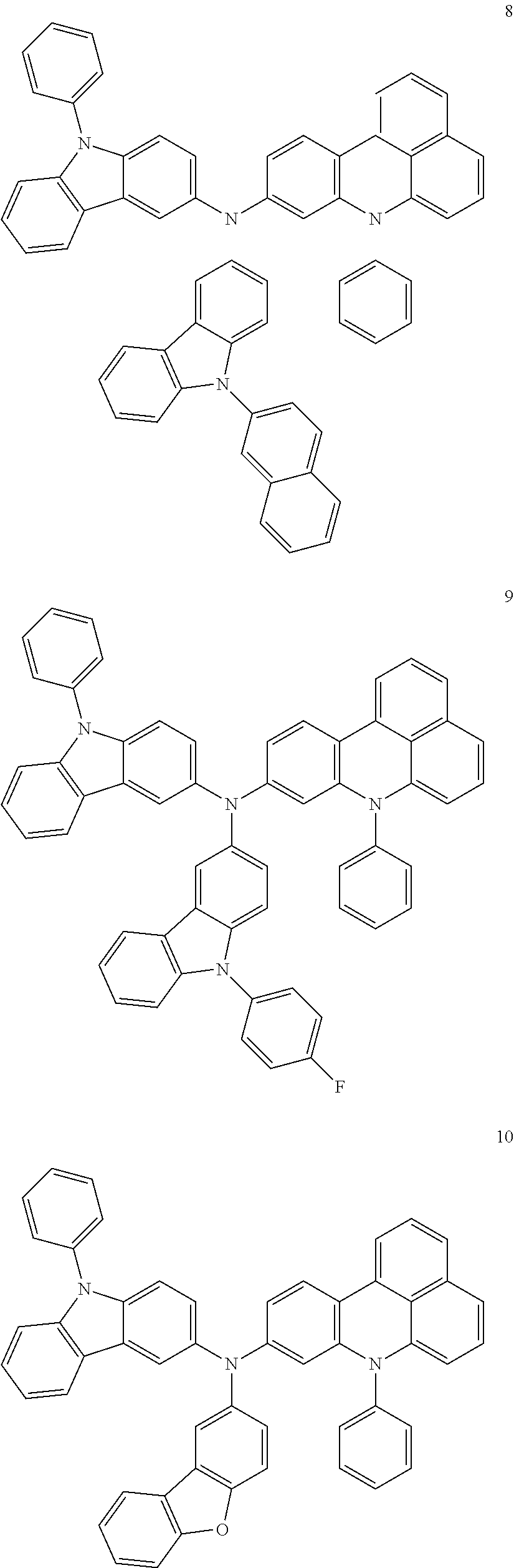 - QBKOAQUATLDKJJ-UHFFFAOYSA-N C1=CC=C(C2=CC=C(N(C3=CC=C4OC5=C(C=CC=C5)C4=C3)C3=CC=C4C5=C(C=CC=C5)N(C5=CC=CC=C5)C5=CC=CC3=C45)C=C2)C=C1.C1=CC=C(C2=CC=C(N(C3=CC=C4SC5=C(C=CC=C5)C4=C3)C3=CC=C4C5=C(C=CC=C5)N(C5=CC=CC=C5)C5=CC=CC3=C45)C=C2)C=C1.FC1=CC=C(N2C3=CC=C(N(C4=CC=C(C5=CC=CC=C5)C=C4)C4=CC=C5C6=C(C=CC=C6)N(C6=CC=CC=C6)C6=CC=CC4=C56)C=C3C3=C2C=CC=C3)C=C1 Chemical compound C1=CC=C(C2=CC=C(N(C3=CC=C4OC5=C(C=CC=C5)C4=C3)C3=CC=C4C5=C(C=CC=C5)N(C5=CC=CC=C5)C5=CC=CC3=C45)C=C2)C=C1.C1=CC=C(C2=CC=C(N(C3=CC=C4SC5=C(C=CC=C5)C4=C3)C3=CC=C4C5=C(C=CC=C5)N(C5=CC=CC=C5)C5=CC=CC3=C45)C=C2)C=C1.FC1=CC=C(N2C3=CC=C(N(C4=CC=C(C5=CC=CC=C5)C=C4)C4=CC=C5C6=C(C=CC=C6)N(C6=CC=CC=C6)C6=CC=CC4=C56)C=C3C3=C2C=CC=C3)C=C1 QBKOAQUATLDKJJ-UHFFFAOYSA-N 0.000 description 1