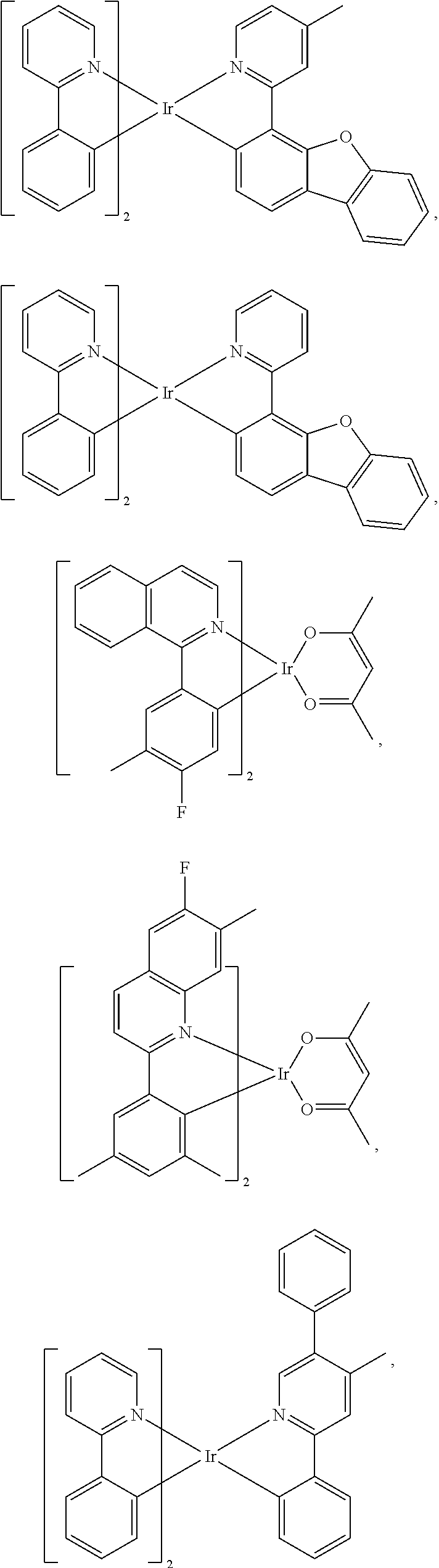 - AYSRYVPCWLDUCZ-VXPRHLHZSA-L C.C.CC1=CC2=C(C=C1)C(C)=CC1=N2[Ir]2(OC(C)=CC(C)=O2)C2=CC=CC=C21.CC1=CC=C2C(=C1)C1=N(C=C3C=CC4=C(C=CC=C4)C3=C1)[Ir]213(OC(C)=CC(C)=O1)C1=CC=C(C2=CC=CC=C2)C=C1C1=N3C=C(C(C)(C)C)C=C1.CC1=NC2=C(C=C1)C1=CC=C3C(=C1O2)C1=N(C=CC(C2=CC=C(F)C=C2)=C1)[Ir]31C2=CC=CC=C2C2=N1C=CC=C2.CC1=NC2=C(C=C1)C1=CC=C3C(=C1O2)C1=N(C=CC=C1)[Ir]31C2=CC=CC=C2C2=N1C=CC=C2.[2H]C([2H])([2H])C1=CN2=C(C=C1)C1=CC=CC=C1[Ir]21C2=CC=C3C4=C(N=C(C)C=C4)OC3=C2C2=N1C=CC=C2 Chemical compound C.C.CC1=CC2=C(C=C1)C(C)=CC1=N2[Ir]2(OC(C)=CC(C)=O2)C2=CC=CC=C21.CC1=CC=C2C(=C1)C1=N(C=C3C=CC4=C(C=CC=C4)C3=C1)[Ir]213(OC(C)=CC(C)=O1)C1=CC=C(C2=CC=CC=C2)C=C1C1=N3C=C(C(C)(C)C)C=C1.CC1=NC2=C(C=C1)C1=CC=C3C(=C1O2)C1=N(C=CC(C2=CC=C(F)C=C2)=C1)[Ir]31C2=CC=CC=C2C2=N1C=CC=C2.CC1=NC2=C(C=C1)C1=CC=C3C(=C1O2)C1=N(C=CC=C1)[Ir]31C2=CC=CC=C2C2=N1C=CC=C2.[2H]C([2H])([2H])C1=CN2=C(C=C1)C1=CC=CC=C1[Ir]21C2=CC=C3C4=C(N=C(C)C=C4)OC3=C2C2=N1C=CC=C2 AYSRYVPCWLDUCZ-VXPRHLHZSA-L 0.000 description 1
