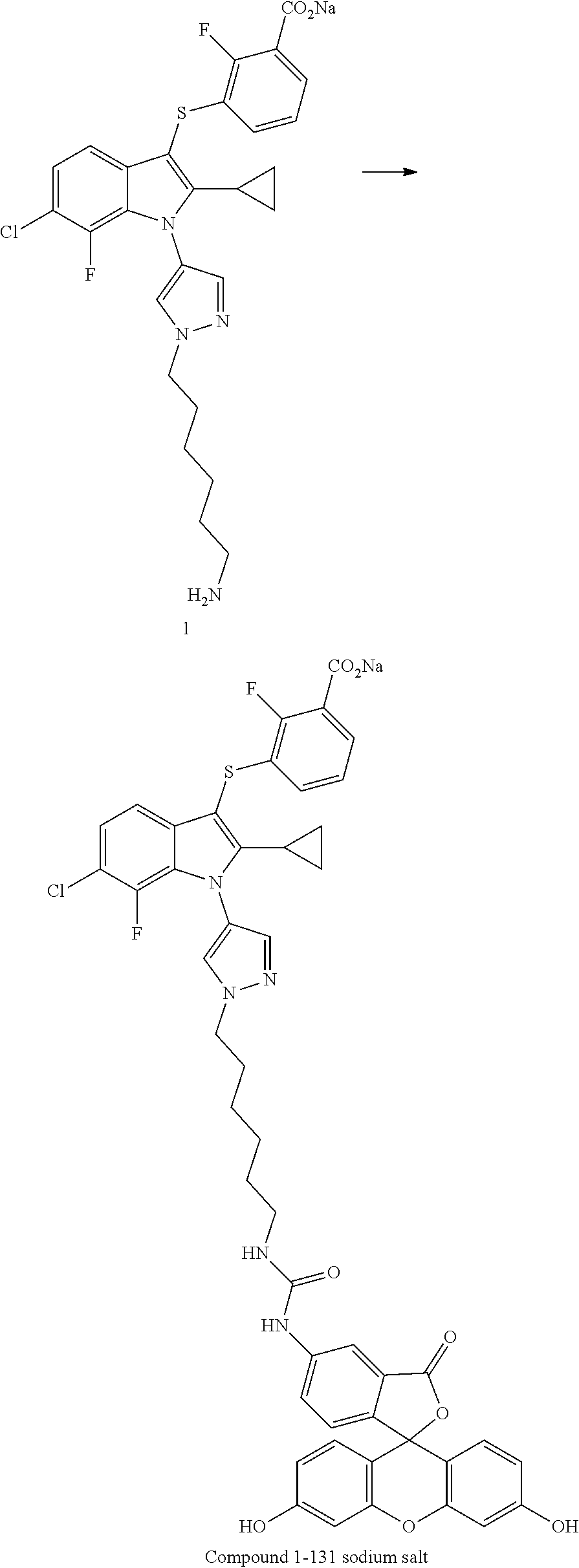 - BTGOSXDEDQYIAZ-UHFFFAOYSA-L NCCCCCCn1cc(-n2c(C3CC3)c(Sc3cccc(C(=O)O[Na])c3F)c3ccc(Cl)c(F)c32)cn1.O=C(NCCCCCCn1cc(-n2c(C3CC3)c(Sc3cccc(C(=O)O[Na])c3F)c3ccc(Cl)c(F)c32)cn1)Nc1ccc2c(c1)C(=O)OC21c2ccc(O)cc2Oc2cc(O)ccc21 Chemical compound NCCCCCCn1cc(-n2c(C3CC3)c(Sc3cccc(C(=O)O[Na])c3F)c3ccc(Cl)c(F)c32)cn1.O=C(NCCCCCCn1cc(-n2c(C3CC3)c(Sc3cccc(C(=O)O[Na])c3F)c3ccc(Cl)c(F)c32)cn1)Nc1ccc2c(c1)C(=O)OC21c2ccc(O)cc2Oc2cc(O)ccc21 BTGOSXDEDQYIAZ-UHFFFAOYSA-L 0.000 description 1
