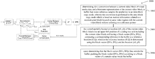 - another method of video processing includes determining, for a conversion between a current video block of visual media data and a bitstream representation of the current video block, a buffer that stores reference samples for prediction in an intra block copy mode; performing the conversion using the reference samples stored in the buffer, wherein the conversion is performed in the intra block copy mode which is based on motion information related to a reconstructed block located in same video region with the current video block without referring to a reference picture; and for a pixel spatially located at location (x0, y0) and having a block vector (BVx, BVy) included in the motion information, computing a corresponding reference in the buffer based on a reference location (P, Q), wherein the reference location (P, Q) is determined using the block vector (BVx, BVy) and the location (x0, y0).