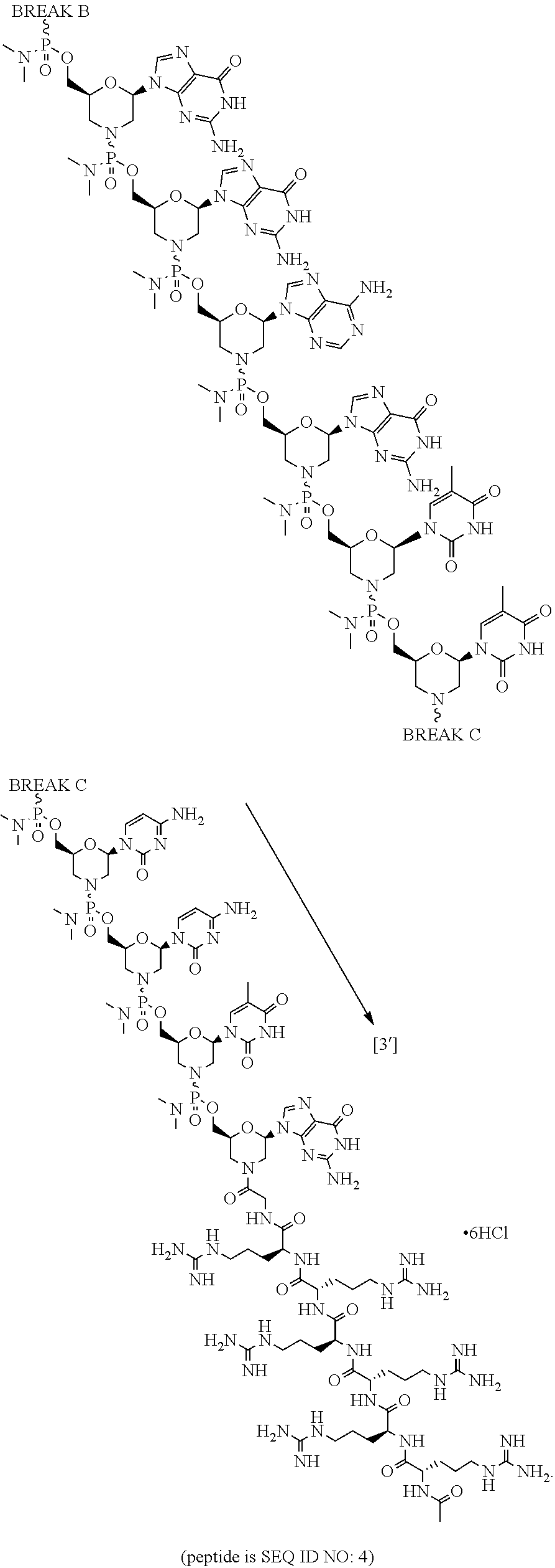 As used herein, the terms “-G-R6” and “-G-R6-Ac” are used interchangeably and refer to a peptide moiety conjugated to an antisense oligomer of the disclosure. In various embodiments, “G” represents a glycine residue conjugated to “R6” by an amide bond, and each “R” represents an arginine residue conjugated together by amide bonds such that “R6” means six (6) arginine residues conjugated together by amide bonds. The arginine residues can have any stereo configuration, for example, the arginine residues can be L-arginine residues, D-arginine residues, or a mixture of D- and L-arginine residues. In certain embodiments, “-G-R6” or “-G-R6-Ac” is conjugated to the morpholine ring nitrogen of the 3′ most morpholino subunit of a PMO antisense oligomer of the disclosure. In some embodiments, “-G-R6” or “-G-R6-Ac” is conjugated to the 3′ end of an antisense oligomer of the disclosure and is of the following formula: