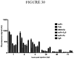 FIG. 29 shows liver fluorescence of IRDye800CW-labeled anti-HER3 IgG and antibody fragments in mice bearing FaDu xenografts. Mean fluorescent signal (arbitrary units) for (from left to right) anti-HER3scFv, Fab, diabody, scFv-C H3, scFv-Fc and IgG in liver at 1, 4, 6, 24, 48 and 72 hours post injection (hpi). AU represents arbitrary units. Error bars represent standard error of the mean.