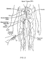 FIGS. 13A and 13B are, respectively, conceptual anatomic views of the arterial and venous vasculatures of a human subject. As shown in FIG. 13A, blood moved by contractions of the heart is conveyed from the left ventricle of the heart by the aorta. The aorta descends through the thorax and branches into the left and right renal arteries. Below the renal arteries, the aorta bifurcates at the left and right iliac arteries. The left and right iliac arteries descend, respectively, through the left and right legs and join the left and right femoral arteries.