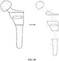 FIG. 69 depicts a further alternate exemplary mass-customized femoral component in accordance with the instant disclosure is depicted. In particular, the mass-customized femoral component comprises five primary elements that include a ball, neck, proximal stem, intermediate stem, and distal stem. Each of the primary elements includes an interchangeable interface to allow interchangeable balls, necks, and stems with the other interchangeable elements. Those skilled in the art will understand that by increasing the number of elements of the mass-customized femoral component, akin to stacking slices of the patient's natural femur to reproduce this bone, one can increasingly approach the fit of a patient-specific implant by using mass-customized elements.