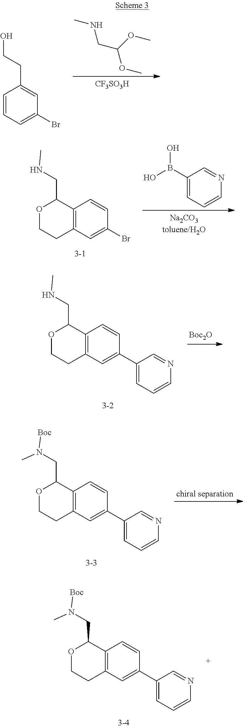 Tert-butyl N-methyl-N-{[6-(1,2-oxazol-5-yl)-1,3,4,5-tetrahydro-2-benzoxepin-1-yl]methyl}carbamate (1.8 g, 5.02 mmol) was separated by chiral column: OD 20×250 mm, 10 um (Daicel), mobile phase: CO2/MEOH (0.2% Methanol Ammonia)=80/20 to provide (R)-tert-butyl (6-(isoxazol-5-yl)-1,3,4,5-tetrahydrobenzo[c]oxepin-1-yl)methyl(methyl)carbamate (700 mg) as a yellow oil. Chiral HPLC: column: EnantioPak OD 4.6×100 mm 5 um; Co-Solvent: MeOH (0.2% Methanol Ammonia); CO2 Flow Rate: 3.6; Co-Solvent Flow Rate: 0.4: Co-Solvent %: 10; Column Temperature: 39.9° C.: Ret Time=1.12 min: Enantiopurity: 99% ee; and (S)-tert-butyl (6-(isoxazol-5-yl)-1,3,4,5-tetrahydrobenzo[c]oxepin-1-yl)methyl(methyl)carbamate (700 mg) as a yellow oil. Chiral HPLC: column: EnantioPak OD 4.6×100 mm 5 um; Co-Solvent: MeOH (0.2% Methanol Ammonia): CO2 Flow Rate: 3.6; Co-Solvent Flow Rate: 0.4; Co-Solvent %: 10: Column Temperature: 40° C.; Ret Time=1.63 min: Enantiopurity: 99% ee.