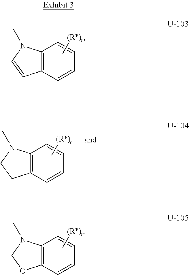 Some examples of a 4- to 6-membered saturated heterocyclic ring optionally substituted with one or more substituents include but not limited to the rings U-106 through U-110 illustrated in Exhibit 3 wherein Rv is any substituent as defined in the Summary for Q1 or Q2, and r is typically an integer from 0 to 4 or 5.