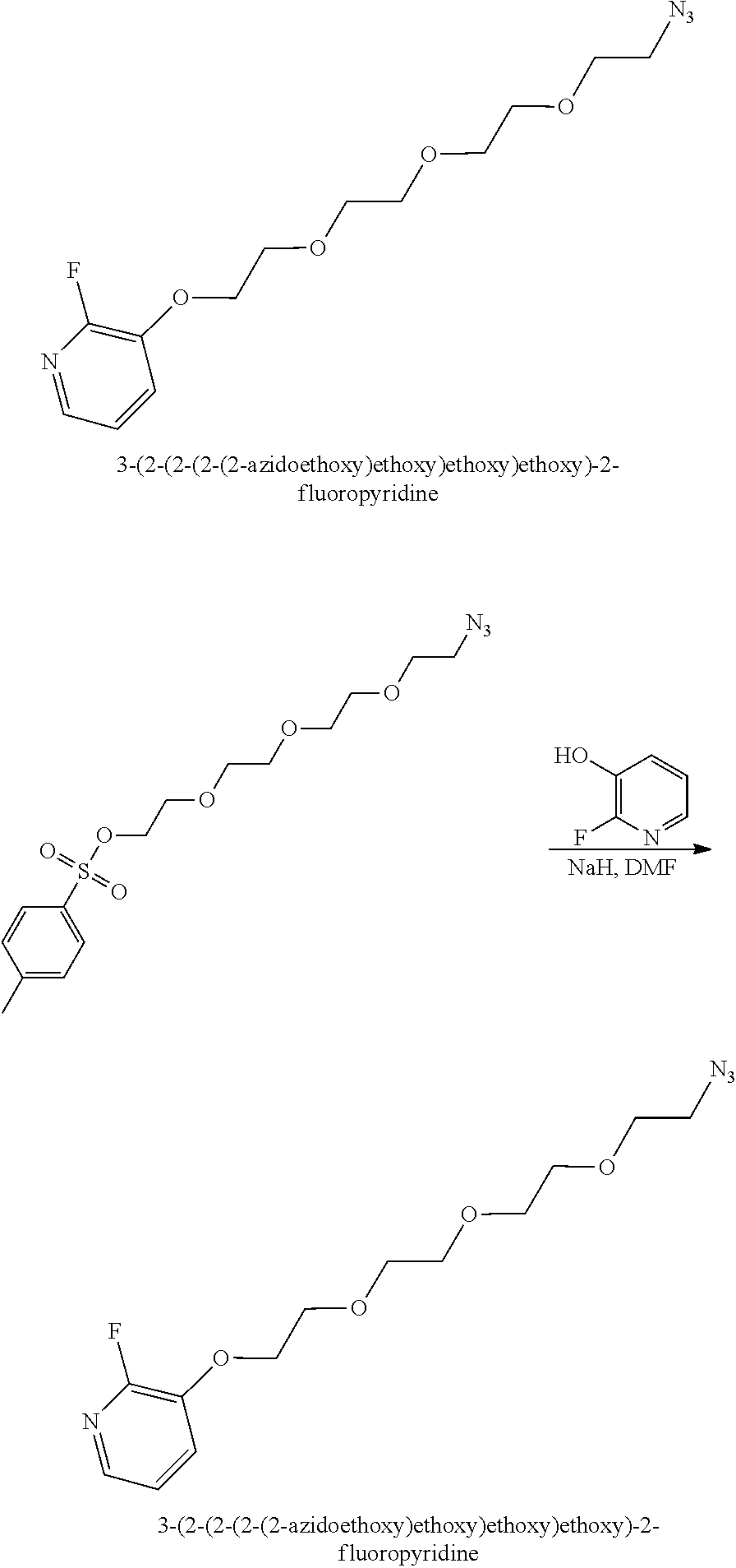 | Kuhnast, B. et al., "PEG-[18F]FPyZIDE and PEG-[18F]FPyKYNE, Two New Fluoropyridine-Based Reagents For the Fluorine-18 Labeling of Macromolecules Using Click Chemistry," Journal of Labelled Compounds and Radiopharmaceuticals, p. S184, Jun. 17, 2009, XP055250504. |