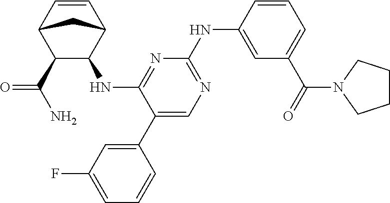 A toluene/H2O (2 mL/0.1 mL) suspension of (1S,2S,3R,4R)-3-((5-bromo-2-((3-(pyrrolidine-1-carbonyl)phenyl)amino)pyrimidin-4-yl)amino)bicyclo[2.2.1]hept-5-ene-2-carboxamid (0.08 mmol, 39.8 mg), cyclopropylboronic acid MIDA ester (0.12 mmol, 23.6 mg), Pd(OAc)2 (0.008 mmol, 1.8 mg), tricyclohexylphosphine (0.016 mmol, 4.5 mg) and potassium phophosphate (0.24 mmol, 51 mg) was heated at 120° C. After 5 hours, the reaction was cooled to room temperature, solid was removed by filtration through a celite pad, and washed with MeOH. Filtrate was collected and solvent was removed in vacuo. Product was purified by RP-HPLC, TFA salt of the product was then free-based by passing a MeOH solution of the salt through a PL-HCO3 column, washing with MeOH. Filtrate was collected and solvent was removed in vacuo. Compound (1S,2S,3R,4R)-3-((5-cyclopropyl-2-((3-(pyrrolidine-1-carbonyl)phenyl)amino)pyrimidin-4-yl)amino)bicyclo[2.2.1]hept-5-ene-2-carboxamide was obtained as a light yellow solid: 4.5 mg (12% yield):