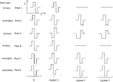 A further illustration of the invention, exemplary waveforms that are provided by the controller to each of pixels 1-6 are shown in FIG. 3 . It is to be appreciated that the waveforms of FIG. 3 are generalizations and do not correspond to achieving a specific color or gray level. Furthermore, waveforms sent by the controller to the various pixels are typically more intricate and may include things such as, for example, preparatory state-erasing pulse, DC-balance pulses, post drive clean-up pulses, etc. Additionally the waveforms shown in FIG. 3 are generalized representations of voltage as a function of time and would typically include both positive and negative voltages.