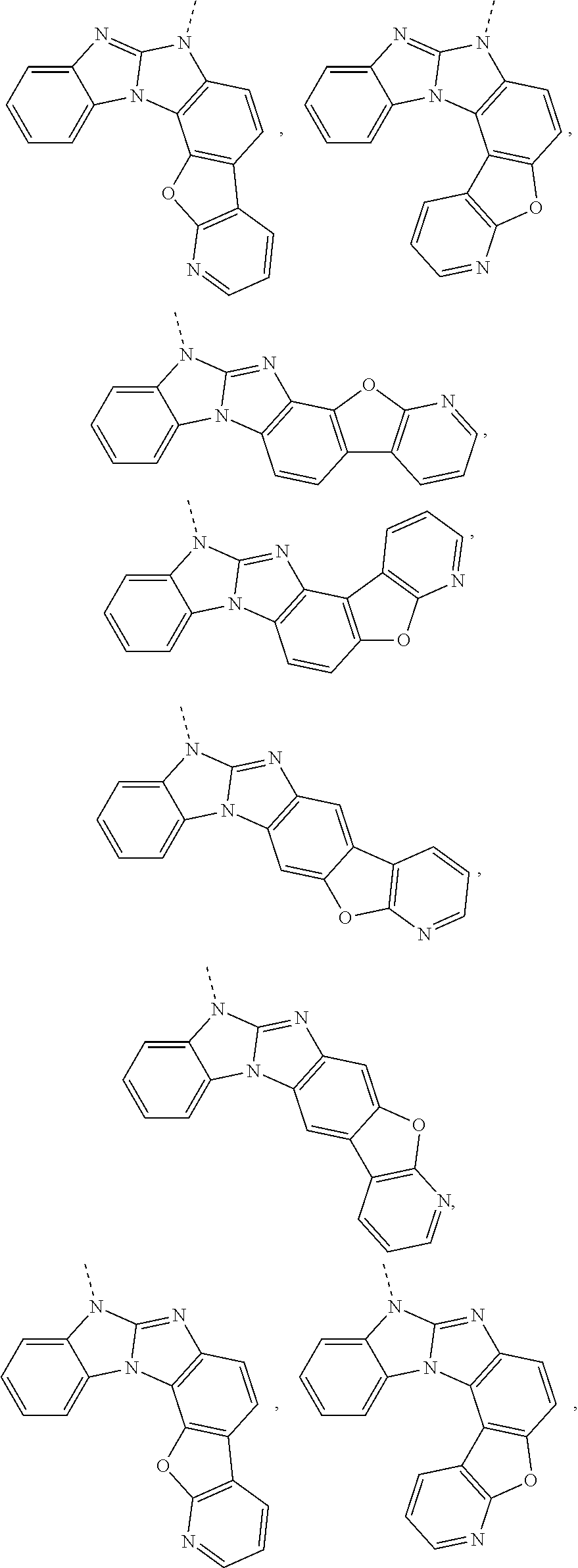 The “aza” designation in the fragments described herein, i.e. aza-dibenzofuran, aza-dibenzothiophene, etc. means that one or more of the C-H groups in the respective aromatic ring can be replaced by a nitrogen atom, for example, and without any limitation, azatriphenylene encompasses both dibenzo[f,h]quinoxaline and dibenzo[f,h]quinoline. One of ordinary skill in the art can readily envision other nitrogen analogs of the aza-derivatives described above, and all such analogs are intended to be encompassed by the terms as set forth herein.