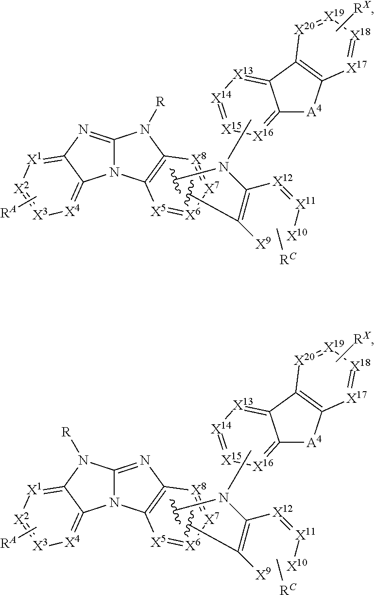 Non-limiting examples of the emitter materials that may be used in an OLED in combination with materials disclosed herein are exemplified below together with references that disclose those materials: CN103694277, CN1696137, EB01238981, EP01239526, EP01961743, EP1239526, EP1244155, EP1642951, EP1647554, EP1841834, EP1841834B, EP2062907, EP2730583, JP2012074444, JP2013110263, JP4478555, KR1020090133652, KR20120032054, KR20130043460, TW201332980, US06699599, US06916554, US20010019782, US20020034656, US20030068526, US20030072964, US20030138657, US20050123788, US20050244673, US2005123791, US2005260449, US20060008670, US20060065890, US20060127696, US20060134459, US20060134462, US20060202194, US20060251923, US20070034863, US20070087321, US20070103060, US20070111026, US20070190359, US20070231600, US2007034863, US2007104979, US2007104980, US2007138437, US2007224450, US2007278936, US20080020237, US20080233410, US20080261076, US20080297033, US200805851, US2008161567, US2008210930, US20090039776, US20090108737, US20090115322, US20090179555, US2009085476, US2009104472, US20100090591, US20100148663, US20100244004, US20100295032, US2010102716, US2010105902, US2010244004, US2010270916, US20110057559, US20110108822, US20110204333, US2011215710, US2011227049, US2011285275, US2012292601, US20130146848, US2013033172, US2013165653, US2013181190, US2013334521, US20140246656, US2014103305, U.S. Pat. Nos. 6,303,238, 6,413,656, 6,653,654, 6,670,645, 6,687,266, 6,835,469, 6,921,915, 7,279,704, 7,332,232, 7,378,162, 7,534,505, 7,675,228, 7,728,137, 7,740,957, 7,759,489, 7,951,947, 8,067,099, 8,592,586, 8,871,361, WO06081973, WO06121811, WO07018067, WO07108362, WO07115970, WO07115981, WO08035571, WO2002015645, WO2003040257, WO2005019373, WO2006056418, WO2008054584, WO2008078800, WO2008096609, WO2008101842, WO2009000673, WO2009050281, WO2009100991, WO2010028151, WO2010054731, WO2010086089, WO2010118029, WO2011044988, WO2011051404, WO2011107491, WO2012020327, WO2012163471, WO2013094620, WO2013107487, WO2013174471, WO2014007565, WO2014008982, WO2014023377, WO2014024131, WO2014031977, WO2014038456, WO2014112450,