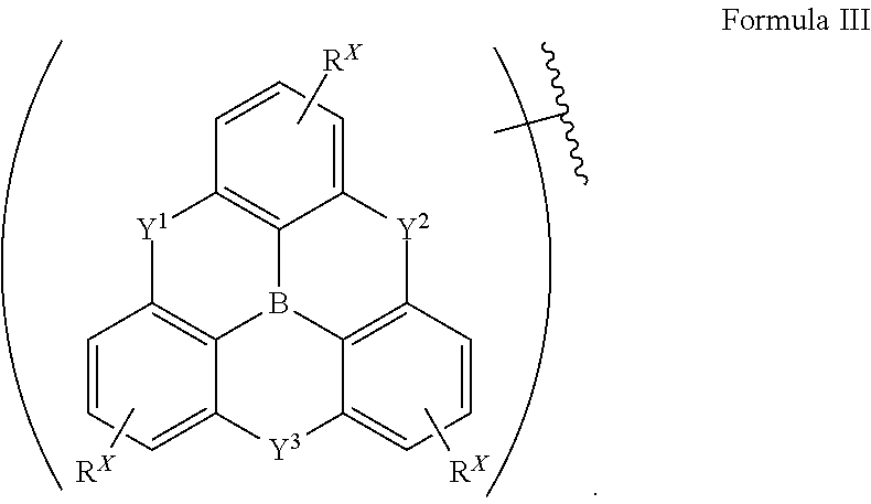 - each occurrence of RY is independently a hydrogen or a substituent selected from the group consisting of Formula III, Formula IV, Formula V, Formula VI, Formula IX, deuterium, halogen, alkyl, cycloalkyl, heteroalkyl, heterocycloalkyl, arylalkyl, alkoxy, aryloxy, amino, silyl, boryl, alkenyl, cycloalkenyl, heteroalkenyl, alkynyl, aryl, heteroaryl, acyl, carboxylic acid, ether, ester, nitrile, isonitrile, sulfanyl, sulfinyl, sulfonyl, phosphino, and combinations thereof;