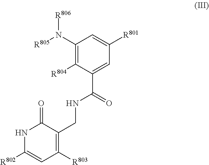 wherein Q2 is a bond or methyl linker, T2 is H, halo, —ORa, —NRaRb, —(NRaRbRc)+A−, or —S(O)2NRaRb, R7 is piperidinyl, tetrahydropyran, cyclopentyl, or cyclohexyl, each optionally substituted with one -Q5-T5 and R8 is ethyl.