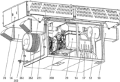 FIG. 5 and FIG. 6 show detailed views of the gas filter device 22 and the first muffler device 23 at the intake port of the intake compartment. In the present embodiment, the intake compartment 2 comprises two sets of gas filter devices 22 and first muffler devices 23 disposed respectively outside two intake ports of the intake compartment. The gas filter device 22 is disposed outside the intake port of the intake compartment, and the first muffler device 23 is disposed between the intake port of the intake compartment and the gas filter device 22. Each set of gas filter device 22 further comprises one inertia separator 221 or a plurality of inertia separators 221 (two inertia separators in the present embodiment) arranged in parallel. The inertia separators 221 are disposed on the outsides of the filter 222. In FIG. 5 and FIG. 6 , a portion of inertia separators 221 and filters 222 are detached to clearly show the positional relationship between the first muffler device 23, the filter 222 and the inertia separator 221. However, it may be appreciated that in practice, the filter 222 substantially entirely covers the outside of the first muffler device 23, the inertia separator 221 substantially entirely covers the outside of the filter 222, and the external views of the intake compartment 2 are shown in FIG. 1 and FIG. 2 when the filter device and first muffler device 23 are entirely and correctly mounted.
