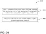 FIGS. 26, 27, 28, 29, 30, 31, 32, 33, 34, 35, and 36 illustrate a top and front perspective view, a bottom and rear perspective view, a bottom view, a rear view, a heel-side view, a toe-side view, a cross-sectional view taken at line 32-32 of FIG. 28 , an enlarged view of area 33 of FIG. 32 , a top cross-sectional view, an enlarged view of area 35 of FIG. 34 , and a method of manufacturing, respectively, of an example golf club according to an embodiment of the apparatus, methods, and articles of manufacture described herein.