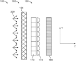 - the filter array can comprise a substrate having a thickness and a first side and a second side, the first side oriented toward the diffuser, the second side oriented toward the lens array and detector, wherein the filter array comprises a plurality of coatings on the second side oriented toward the lens array to inhibit cross-talk among lenses of the array.