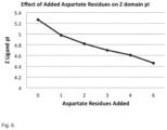 Results and Discussion Single Z domain pI decreased linearly from 5.3 to 4.5 (approx. an order of magnitude) as 0 to six acidic residues were added. No significant difference was seen if aspartate versus glutamate residues were added or if the acidic residues were interspaced with neutral residues (not shown). These results suggest even adding in one or two acid residues may affect pI related charge properties of the domain. It was expected however than more charged groups (e.g. 3-6) might be required to show appreciable local region buffering effects. Significant expected effect of AJR modification with four mono-, di-, or tri-acid residues on pH versus net charge tetrameric Z4 model ligand (FIG. 7 ) was verified. A strong effect, which increased with acid residue addition, was seen at normal adsorption pH 7 with little effect at elution pH 3 when the acid residues were uncharged. At pH 7 the domains should offer enhanced buffering of local surface pH changes related to binding of basic mAb protein targets. Some differences were noted at pH 3-4.5 which may allow for favorably altered elution pH. Variation in the charge nature of mAbs was investigated using literature data from three Genentech mAbs which at pH 7 exhibited net positive charge from +25, +1+, and +5 (FIG. 8 ). Results suggest (FIG. 9 ) that native tetrameric Z4 ligand complexed with one to four mAbs should vary in net charge at pH 7 of from −5 to approximately +42, +12, +2 as only two mAbs were bound per ligand, respectively. Binding 4 mAbs would double the positive charge density suggesting a significant, nonsteric, barrier to additional mAb binding. Addition of even three charged residues per AJR was able to significantly reduce such effects.