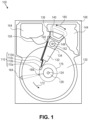 With further reference to FIG. 1 , electrical signals (e.g., current to the voice coil 140 of the VCM) comprising a write signal to and a read signal from the head 110 a, are transmitted by a flexible cable assembly (FCA) 156 (or “flex cable”, or “flexible printed circuit” (FPC)). Interconnection between the flex cable 156 and the head 110 a may include an arm-electronics (AE) module 160, which may have an on-board pre-amplifier for the read signal, as well as other read-channel and write-channel electronic components. The AE module 160 may be attached to the carriage 134 as shown. The flex cable 156 may be coupled to an electrical-connector block 164, which provides electrical communication, in some configurations, through an electrical feed-through provided by an HDD housing 168. The HDD housing 168 (or “enclosure base” or “baseplate” or simply “base”), in conjunction with an HDD cover, provides a semi-sealed (or hermetically sealed, in some configurations) protective enclosure for the information storage components of the HDD 100.
