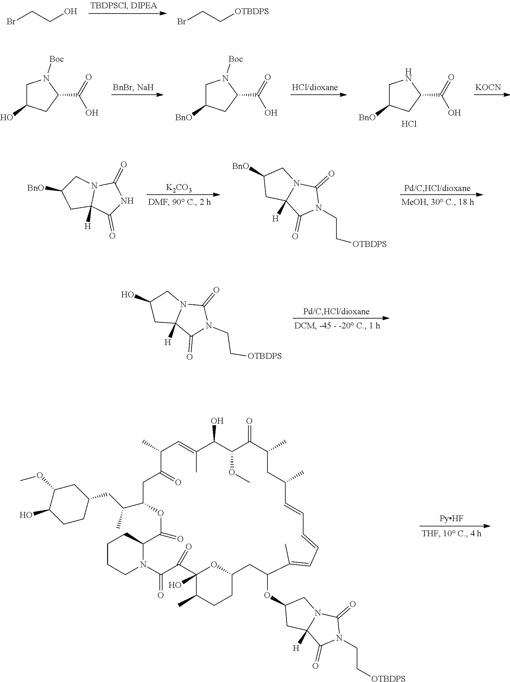 To a solution of (23E,25E,27E,28E,32R,33S,34R,35R,37S,39S,41S,42S,43R,44R,53R)-43,53-dihydroxy-41,44-dimethoxy-42-[(1R)-2-[(1S,3R,4R)-3-methoxy-4-(2-methoxyethoxy)cyclohexyl]-1-methyl-ethyl]-32,33,34,35,45,46-hexamethyl-62,63-dioxa-54-azatricyclohexatriaconta-23,25,27(45),28(46)-tetraene-47,48,49,50,51-pentone (0.2 g, 0.2 mmol) and 2-(oxetan-3-yloxy)ethanol (0.8 g, 6.77 mmol) in THF (10 mL) at 50° C. under N2 was added HND-8 (0.09 g). The reaction was stirred for 18 h at 50° C. then cooled, filtered, poured into saturated aqueous NaHCO3 (4 mL) at 0° C. and extracted with EA (30 mL). The organic layer was washed with water (30 mL) and brine (30 mL), dried over anhydrous sodium sulfate, filtered and concentrated. The residue was purified via silica gel chromatography (EtOAc 100%) and reverse phase chromatography (eluting with 60% CH3CN in water) to provide the titled compound (0.015 g, 7% yield) as a white solid. ESI-MS (EI+, m/z): 1080.6 [M+Na]+. 1H NMR (400 MHz, CDCl3) δ 6.39-5.93 (m, 4H), 5.66-4.76 (m, 5H), 4.31-3.96 (m, 2H), 3.84-3.67 (m, 9H), 3.65-3.51 (m, 4H), 3.46-3.28 (m, 12H), 3.26-2.96 (m, 5H), 2.86-2.55 (m, 3H), 2.35-2.19 (m, 2H), 2.05-1.83 (m, 4H), 1.77-1.54 (m, 24H), 1.55-1.20 (m, 11H), 1.14-0.79 (m, 18H), 0.80-0.65 (m, 1H).