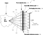 - Each of the re-imaging lenses 128 a is spatially aligned with a respectively-corresponding region of the divided aperture and, therefore, with respectively-corresponding spatial channel 120 to form, on the FPA component 136 a single sub-image of the object 110 .