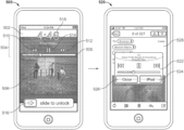In some implementations, upon invocation of particular device functionality, the graphical user interface 500 can be changed or replaced with another user interface or user interface elements, to facilitate user access to functions associated with the corresponding invoked device functionality. As an example, in response to a user sliding the locking control 516, the touch-sensitive display 502 can be unlocked, and a new view can be presented in the user interface. The new view may include a different interface, for example, interface 520. The interface 520 depicts a HUD audio interface 522 with display elements related to various audio functions. Similar to HUD audio interface 504, the HUD audio interface 522 includes audio controls for volume, fast forward, rewind, and play/pause. Additional information can be shown in the HUD audio interface 522, such as a current song (generally in play). In this example, the current song is displayed as “Grace Finds Beauty In Everything” from the band “U2” on the album “Beautiful Day.” In some implementations, more or less information can be shown about the current song. In addition, the HUD audio interface 522 provides the user with the option to enter “iPod” mode by selecting an iPod button 524 to select other albums, songs, or media. For example, if the user selects iPod button 524, the user interface 520 can present an MP3/video library or other audio related selection within the device. The user interface 520 may include various artists, songs, videos, and other media selectable for play or view in the user interface 520. In addition, the unlocked user interface 520 can allow the user to interact with any or all device options.