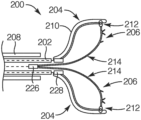Now with reference to FIGS. 14A and 14B, another embodiment of a medical device 200 coupled to a distal portion of a delivery catheter 202, the medical device 200 (depicted in a simplistic profile view) in a partially deployed position and fully deployed position, respectively, is provided. As in previous embodiments, the medical device 200 may include an occluder portion 204 and an anchor portion 206 that may be separately deployed. For example, once a sheath 208 is positioned in the LAA (not shown) with the medical device 200 at a distal end portion thereof, the sheath 208 is withdrawn to deploy an occluder portion 204 of the medical device 200 or to partially deploy the medical device 200. Once the occluder portion 204 is deployed, then the anchor portion 206 may be deployed, to fully deploy the medical device 200.