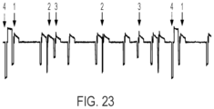 FIG. 23 illustrates a trace of a differentially multiplexed signal comprising four different signals, with signals 1, 2, and 3, multiplexed in one electrode array to target particular types of neural cells, while signal 4 is multiplexed with the other three signals at a different frequency using the same or another electrode array to target another type of neural cells, signal 2 has a different pulse width, while all signals differ in pulse frequency and intensity, in accordance with exemplary aspects of the disclosure; and