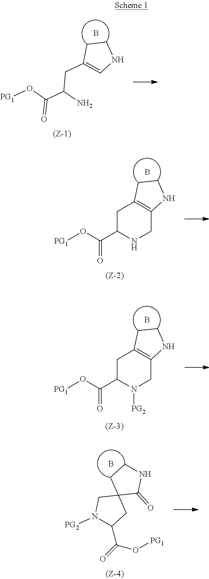 Scheme 1 illustrates a general method to prepare the compound of formula (I-1) from the amino ester compound (Z-1), wherein B is as previously defined and PG1 is C1-C4 alkyl or Bn. Treatment of amine (Z-1) with formaldehyde affords the cyclized amine (Z-2), which is converted to (Z-3) using appropriate protecting group PG2 (e.g. Boc). Treatment of (Z-3) with NBS in solvents containing AcOH at low temperature provides the rearranged spiral proline derivative (Z-4). Examples of this sequence of transformation has been reported in literature (Pellegrini C. et al. “Synthesis of the Oxindole Alkaloid (−)-Horsfiline” Tetrahedron Asymmetry, 1994, vol. 5, No. 10, pp 1979-1992; Efremov, I. V. et al. “Discovery and Optimization of a Novel Spiropyrrolidine Inhibitor of (3-Secretase (BACE1) through Fragment-Based Drug Design” Journal of Medicinal Chemistry, 2012, 55, 9069-9088). Hydrolysis of ester (Z-4) provides acid (Z-5), which can be converted to Weinreb amide (Z-6). Treatment of (Z-6) with organometallic spicies X—Li or X—MgBr, wherein X is previously defined, affords ketone (Z-7). Removal of protecting group PG2 on (Z-7) gives amine (Z-8). Condensation of the amine (Z-8) with acid (Z-9), wherein A, R1, R2, and R3 are as previously defined, under amide coupling conditions (e.g. HATU, EDC, DCC, etc) provides amide compound (I-1).
